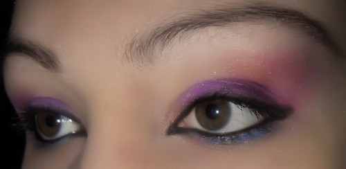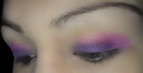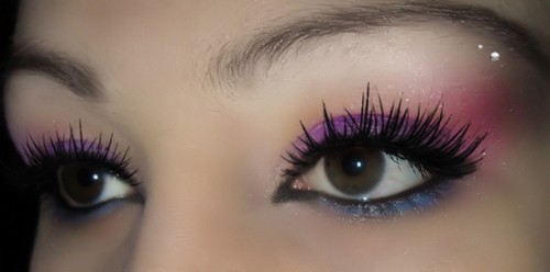 Шаг 1. Первым делом мы нанесем фиолетовые тени на все подвижное веко, причем предельно аккуратно, дабы не выходить за границы формы глаза.