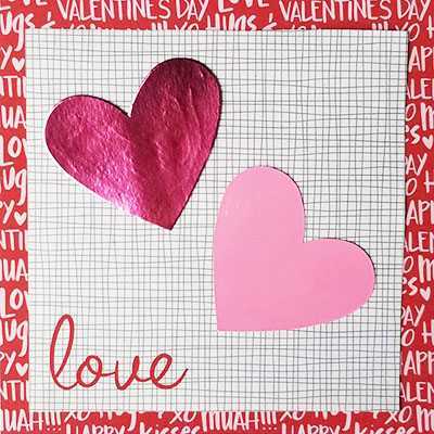 Вот еще один пример милой валентинки, выполненной в технике скрапбукинг. Оригинальный фон с надписями, два сердечка и слово «Love».