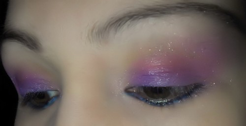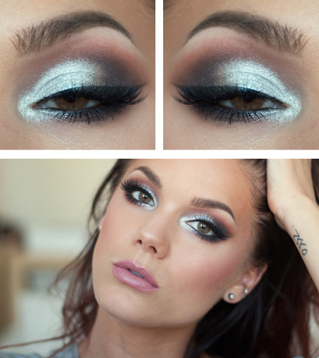 Шаг 4. Поверх них немного нанесем белые блестки, очень редким слоем, а нижнее веко обработаем ярко-синими тенями.