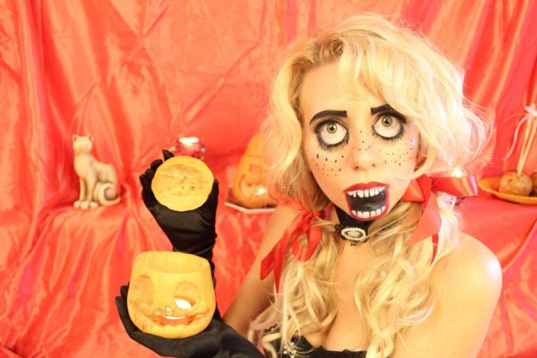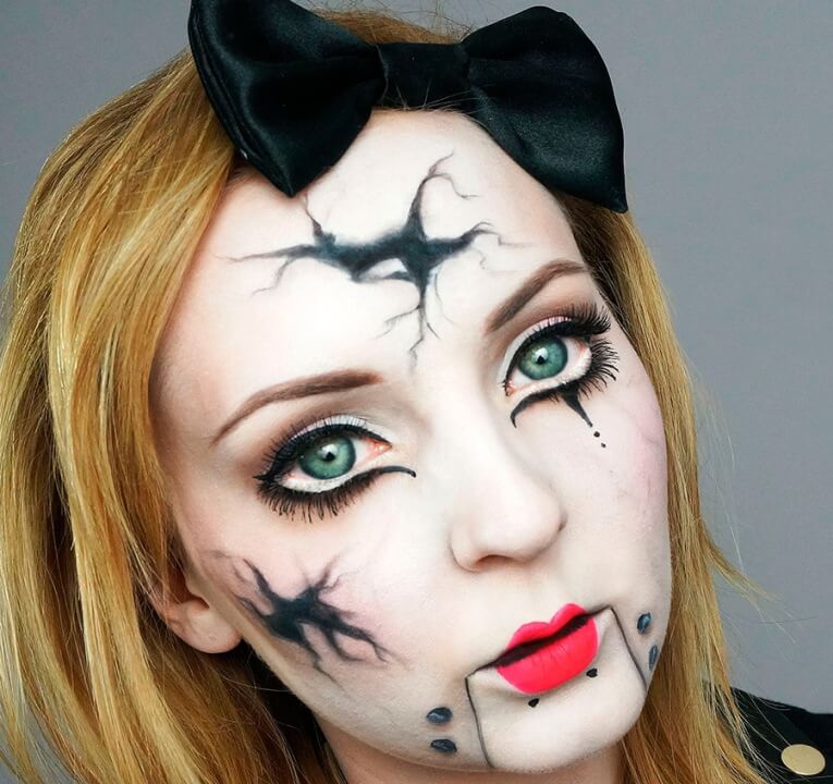 Фарфорово-белое личико, выразительные глаза с длинными ресницами, губки бантиком. Кукольное лицо легко создать с помощью макияжа. Только вот какой кукле оно будет принадлежать? Учитывая специфику праздника, на вечеринку может явится не только милая Барби, но и кукла из фильма ужасов. У нее трагическое выражение и следы повреждений на лице.