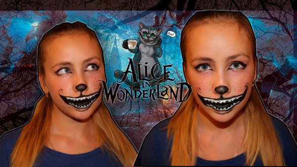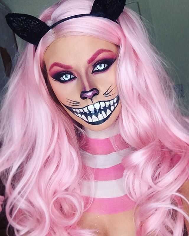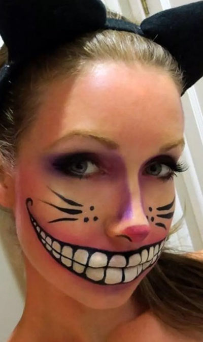 Часто девушки выбирают образ кошечки или другого представителя этого семейства. Это неудивительно: ведь кошки – грациозные создания. Но не менее популярен на Хэллоуин Чеширский Кот из «Алисы в стране Чудес». Самое сложное в создании образа Чеширского Кота – это его улыбка.