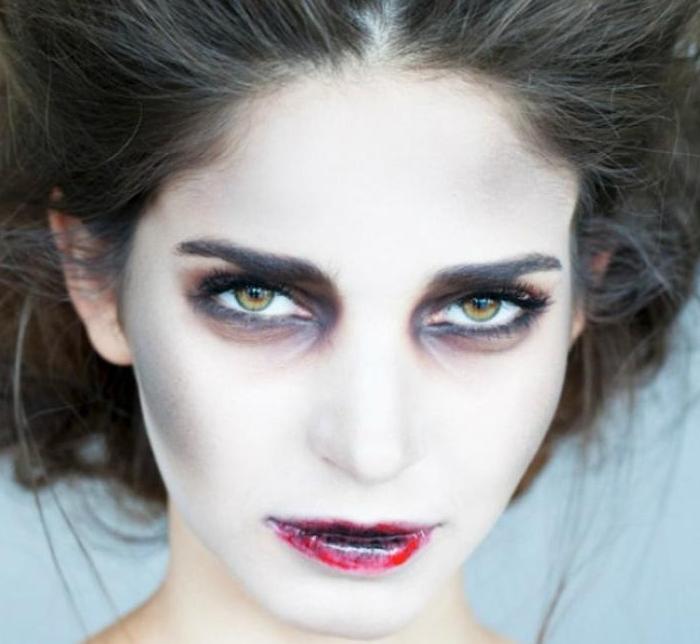 Можно подчеркнуть вид крови с помощью красных теней и нанести помаду такого же цвета.
