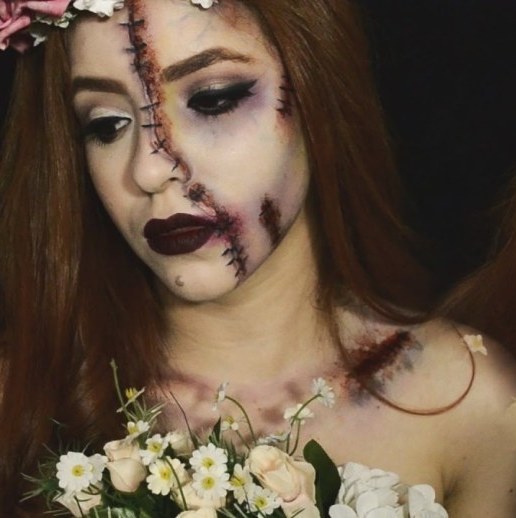 Создавая такой макияж, тон кожи необходимо сделать бледным. Уместно добавить в наносимое средство красящий пигмент, чтобы добиться мертвенно-голубоватого или зеленоватого оттенка лица. Для глаз воспользуйтесь правилами макияжа смоки айс, чтобы сделать их максимально глубокими и выразительными. Губы окрасьте в темно-красный, винный или черный цвет. Завершат макияж мертвой невесты нарисованные красным карандашом раны, темные пятна на коже, намекающие на разложение.
