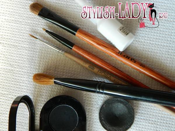 Заполняем конец стрелки и уголок глаза чёрными тенями. Тушуем чёрные тени в зону складки, смешивая вместе со сливовым. Очень легко прорисовываем полупустой кистью тёмные круги под глазами.