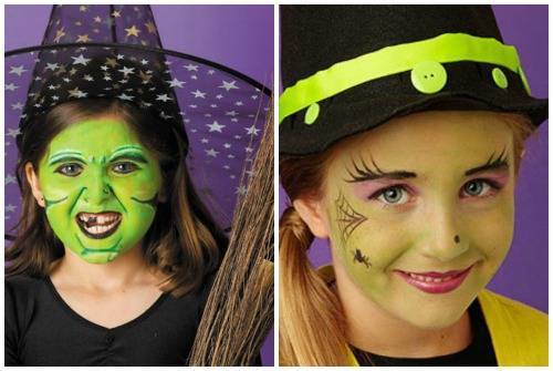 Макияж «Ведьмочка». Фото грима ведьмы встречаются повсеместно во многих вариациях исполнения. Злющая и противная ведьма требует грима зеленого цвета. Вся кожа лица и шеи ребенка закрашивается полностью. Бородавки и морщины рисуются карандашом для глаз. Тем же карандашом рисуется декор- паутина. Завершить макияж ведьмы на Хэллоуин поможет помада яркого цвета или блеск для губ.