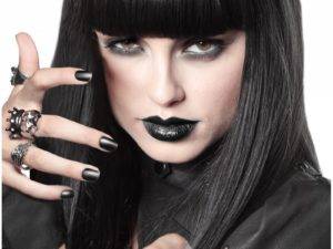 Макияж губ выполняют преимущественно в тёмных тонах. Для наведения контура используют чёрный карандаш, а на поверхность наносят тёмно-бордовую или ярко-красную помаду. Можно использовать технику «градиент», о которой подробно рассказано в статье на нашем сайте. Только для комбинации используют мрачные оттенки помад или блесков.
