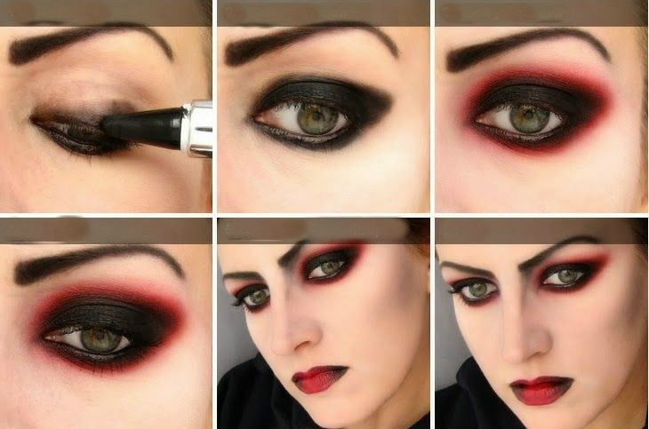 Бледная-бледная кожа, алые губы, темные круги под глазами — классический вариант мейка для подружки Дракулы. Смотрится такая вампирша ярко и жутко красиво. То, что надо для намеченного торжества.