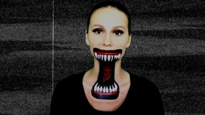 Такой образ леденит сердце, вызывает дрожь по телу. Не желаем кому-нибудь встретиться в темном переулке с этим персонажем. Лицо разделите на 2 части, одну из которых изобразите в черно-белых тонах, на второй сделайте привычный макияж. Вокруг глаза, веко, половину носа, область возле уха затонируйте черными тенями, выделите цветом челюсти.