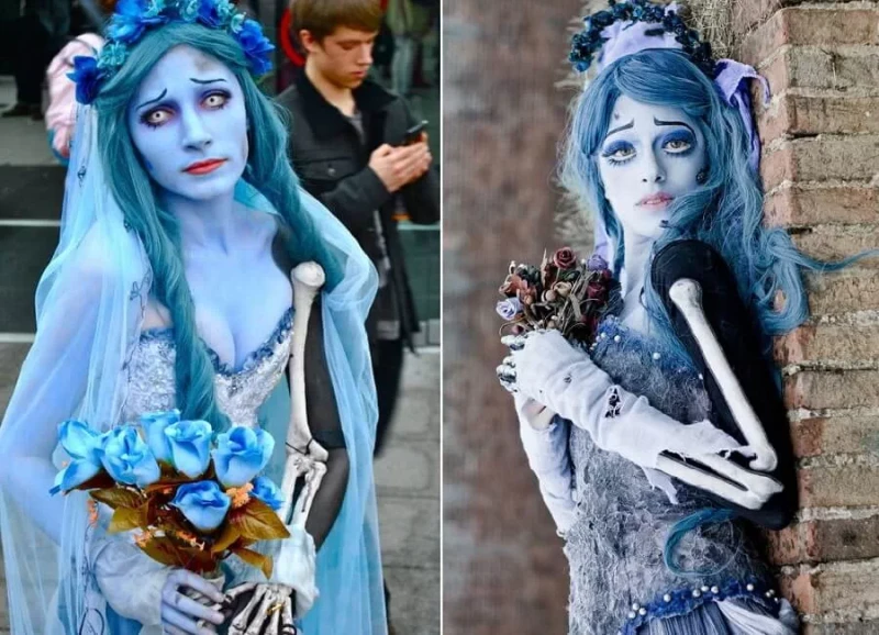 Образ этого яркого персонажа подразумевает наличие старого свадебного платья (желательно, порванного, грязного), синего парика, цветочного венка и фаты. Кроме того, необходимо сделать соответствующий макияж на Хэллоуин в домашних условиях.
