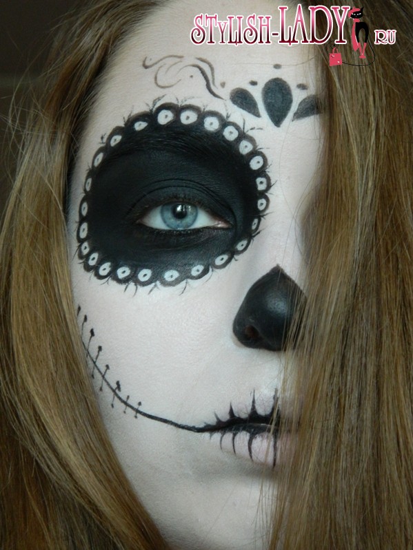 На самом деле разрисовать лицо можно любыми цветами и в любой последовательности. Главное, прорисовать элементы таким образом, чтобы макияж напоминал череп.