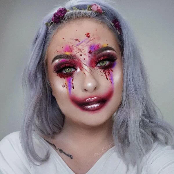 Make-up «Клоунесса». Какими бывают клоуны нам уже известно из десятков фильмов ужасов. Поэтому подобный makeup клоуна отлично подойдет для Хэллоуина. С помощью грима разных ярких цветов воссоздайте облик клоуна на лице и изобразите зловещую улыбку.