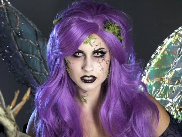 - Дополните образ колдуньи париком и аксессуарами. Страшный макияж ведьмы для девушек на Хэллоуин своими руками завершен.