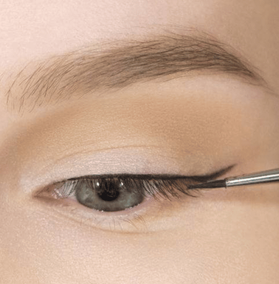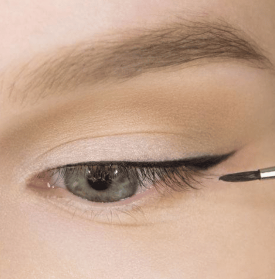 Нанесите гелиевой или кремовой подводкой тонкую линию, визуально продолжающую линию глаза. Работайте синтетической кисточкой. Глаза во время рисования линий держите открытыми.