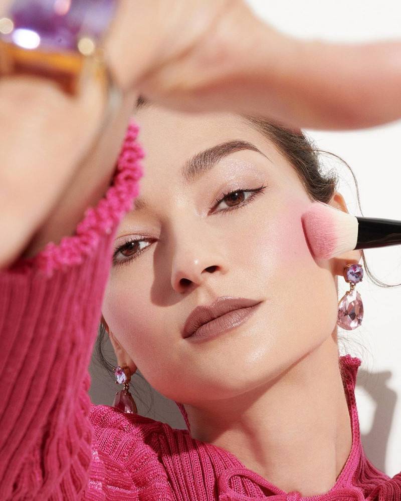 - Если тени в коричнево-бежевых тонах, румяна должны быть бронзовыми, если темнее — розовыми, коричневыми, красными.