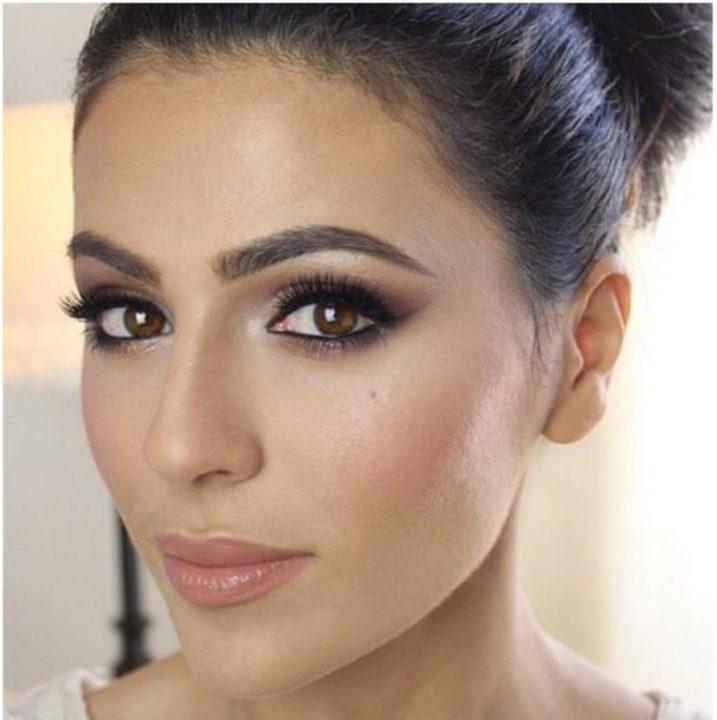 - Ресницы красят в один слой черной или коричневой тушью. На губы наносят нюдовую помаду или блеск. Румяна, как правило, используют персикового цвета. Брови просто прокрашивают гелем и оттеняют карандашом или тенями.