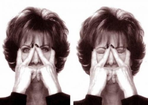 Поставьте указательный и средний пальцы на уголки глаз (как показано на фото), слегка прижмите их и попытайтесь закрыть нижнее веко, прищуривая его. Удержите на несколько секунд, затем расслабьте. Данное действие повторяйте от 10 до 20 раз.