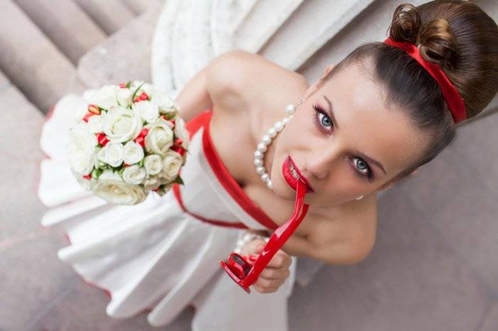 В макияже невесты можно отразить палитру свадьбы. Например, на торжество в красно-белом цвете можно накрасить губы красной помадой, если, конечно, такой вариант яркого свадебного макияжа подходит вашей коже и образу в целом.