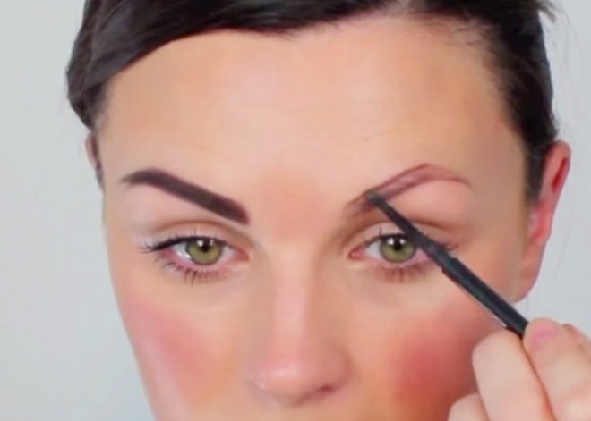 Брови слегка подкрашиваются карандашом в цвет волос, только блондинки могут использовать тон темнее. Можно воспользоваться специальным воском, чтобы линия бровей была четкой, волосинка к волосинке.