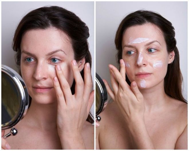 Сначала нужно провести обычную процедуру – очистить кожу и увлажнить ее кремом. Не забыть нанести и специальный крем вокруг глаз. Подождать несколько минут, пока впитается.