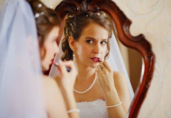 За 2-3 дня до свадьбы необходимо сделать коррекцию бровей. И самое главное – надо четко определиться с образом невесты, который будет гармонировать со свадебным нарядом, прической, нарядом жениха. Обязательно следует порепетировать перед зеркалом – попробовать разные оттенки теней, помады, пудры.
