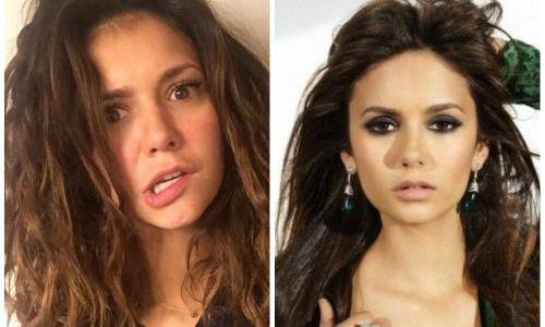 - Нина Добрев без косметики выглядит милее, хотя черты лица не такие изящные, как с мейк апом: легкую округлость щечек девушка мастерски нивелирует правильно нанесенными румянами.