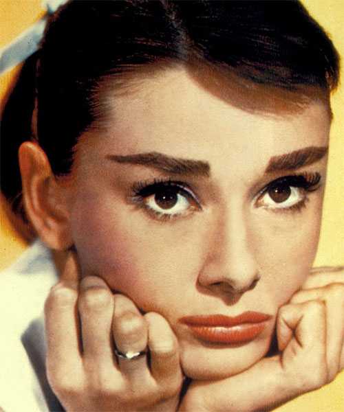 Одри довольно редко использовала накладные ресницы, потому что сама по себе была обладательницей роскошных, темных и густых ресниц. Если таковых нет, то можно использовать накладные. Так как они должны выглядеть естественно, то советуют применить небольшие пучки ресниц в уголках глаз. Большие глаза, при этом, подчеркиваются черным карандашом на верхнем веке.