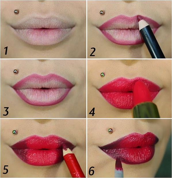 1. Визуально увеличивать губы и/или делать их более «пухлыми». Темный контур и более светлая середина губ создает необычный эффект – губы моментально становятся пухлыми. При помощи омбре любые, даже самые тонкие губы, станут ярче и объемнее.
