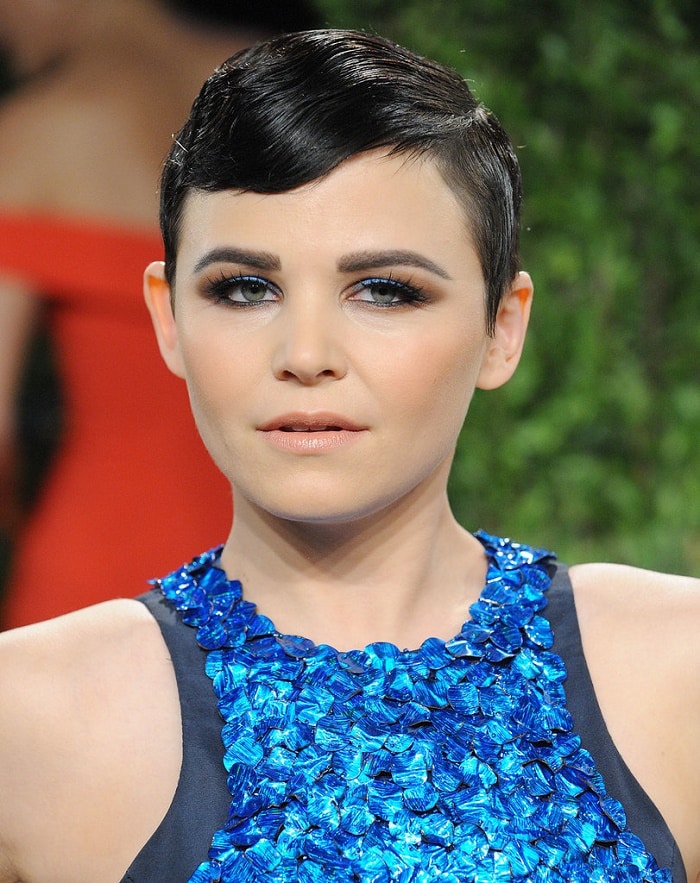 Тени для повседневного макияжа — терракотовые или золотистые, для создания вечернего образа хороши контрастные комбинации, например, сияющий кристальный плавно затемняется до черноты к внешнему уголку верхнего века, верхняя часть подчёркивается полосой цвета кофе с молоком. Немного хайлайтера под бровью придаст взгляду открытость, сами брови максимально приближёны к естественным