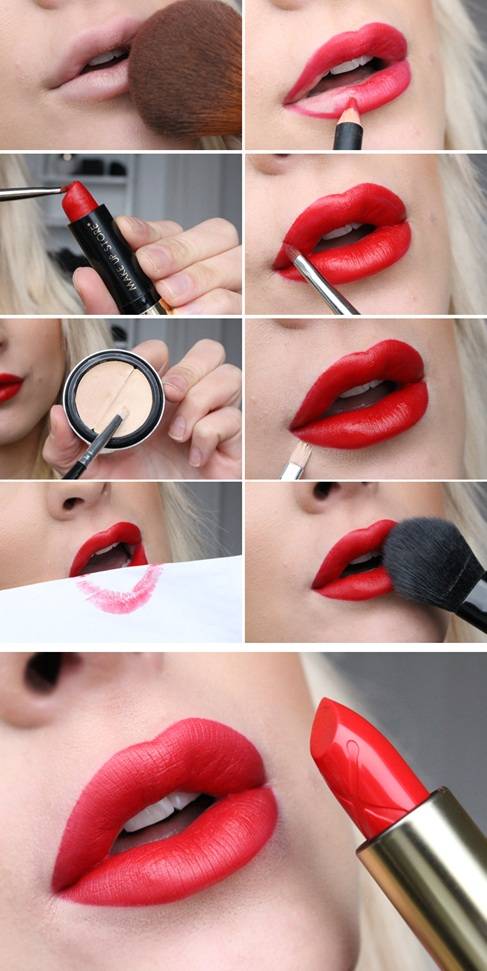 - следующий шаг – использование красного косметического средства, которое лучше наносить с помощью кисточки; покрытие красным цветом происходит от середины верхней и нижней губ к краям; наносить данный яркий тон следует в 2 слоя;