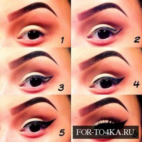 Глаза.Процесс рисования стрелокПриведенный ниже коллаж наглядно показывает, как создать красивый и правильный макияж глаз, используя светлые тени и подводку. Именно такой итоговый вариант мейк-апа отлично сочетается с различными тонами красной помады.