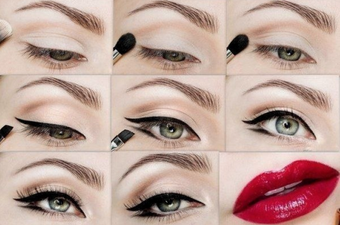 - Макияж под красную помаду несовместим с ярким подчёркиванием глаз. Допускается использование нейтральных теней и небольшое количество туши. Для создания вечернего образа можно нарисовать стрелки.