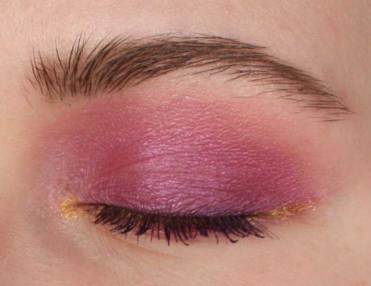 Остатками теней на кисточке проработайте участок под складкой века (от внешнего уголка до середины века). Хорошо растушуйте все границы цветов. Тонкой плоской кистью сделайте легкую подводку нижнего века этим же цветом.