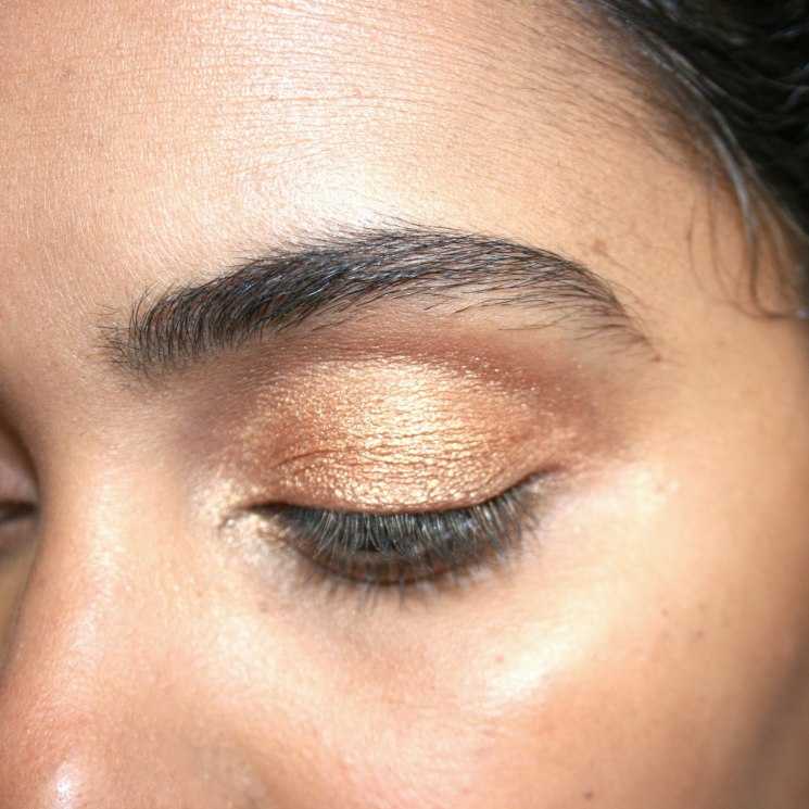 - Чтобы высветлить внутренний уголок, возьмите тени самого светлого оттенка (кремового, светло-золотистого). Тонкой кистью поставьте точку у внутреннего угла и растушуйте оттенок по направлению к середине века. Остатками теней на кисточке высветлите область под бровями.
