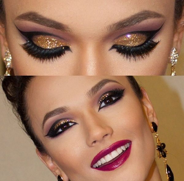 - В этом случае длинные и густые ресницы могут стать самым лучшим вариантом. Их можно накрутить, дополнить блестящими тенями и глиттерной помадой.