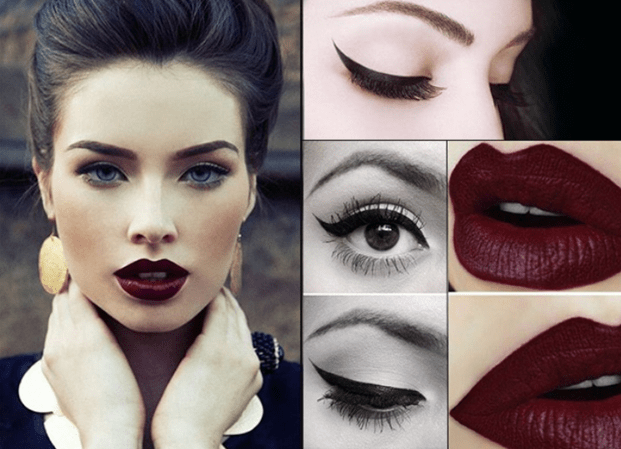 Если в вашем наряде присутствуют черный и красный цвета, то в макияже губ воспользуйтесь оттенками красного, идентичным с вашим платьем. Отдайте предпочтение «дымчатым» глазам, темно-серым теням и ярким, насыщенным оттенкам губной помады.
