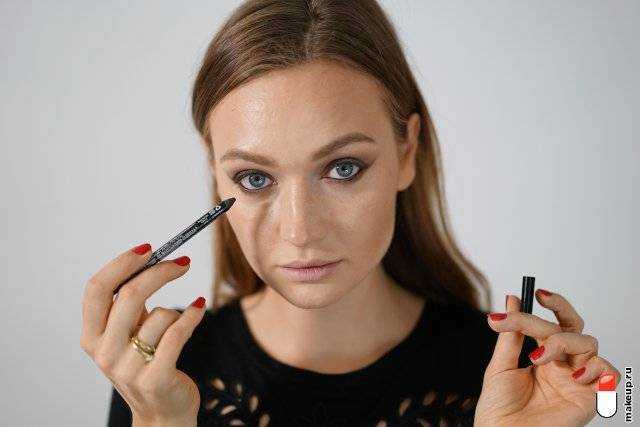 - Черными тенями продублируйте карандашную подводку и сделайте растушевку, добиваясь плавного перехода между оттенками, — так, чтобы не было видно границ.
