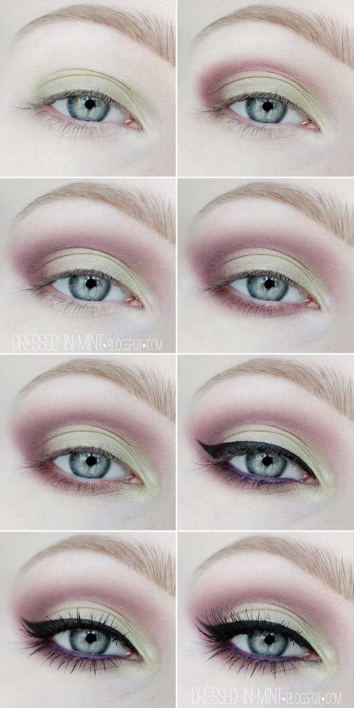 Практически всегда обладательницы светлых и ясных голубых глаз наделены и светлым оттенком кожи. Поэтому «белоснежкам» лучше воздержаться от темных оттенков теней, чтобы не было слишком большого контраста между кожей и макияжем. Если вы не хотите быть похожей на панду, то возьмите серые оттенки теней. Их можно комбинировать с нежно-розовыми. Если вы делаете вечерний макияж, то добавить немного серебряного.
