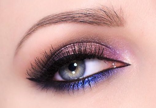 - Верхнее веко покрыть голубыми тенями, а поверх них по углам распределить синие. Чем насыщеннее будет цвет синих теней, тем лучше.