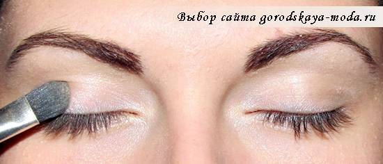 - Подвижное веко накрасить белыми тенями с перламутром. В складку нанести тени серого оттенка. Также подойдут коричневые тона. После этого средство необходимо тщательно растушевать.