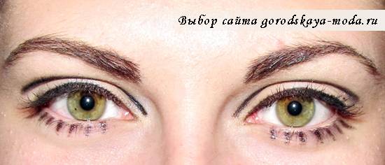 Теперь нам видно, где во внешнем уголке можно добавить ресниц по нижнему веку, которые дорисовываем подводкой.