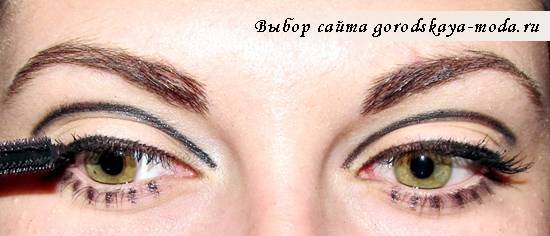 - Заключающий штрих – нанесение туши на ресницы. Именно от успешного выполнения этого шага будет зависеть весь полученный эффект. Ресницы должны быть слегка склеены и густо намазаны тушью. Допустимо также подрисовывание волосинок на нижнем веке. Чтобы ресницы хорошо слипались, можно использовать тушь со специальным эффектом или воспользоваться помощью пинцета. Чтобы не испачкать веки, в момент прокрашивания ресниц можно подкладывать ватные диски.