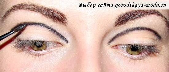 Первым элементом прокрасим стрелку по верхнему веку. Она должна быть очень тонкой и начинается чуть ближе к переносице.