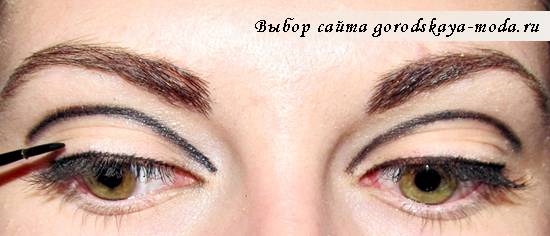 При помощи той же кисточки и подводки нарисуйте небольшую стрелочку вдоль роста верхних ресниц. Ее можно делать самых разных форм, в зависимости от предпочтений и формы глаза. Но стрелочка, все же, должна быть небольшой.