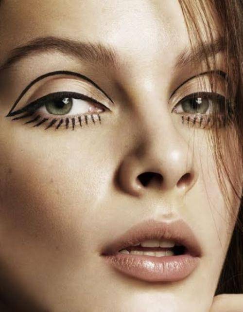 Теперь перешли к еще одной особенности, а именно к нижним ресничкам. Их обычно не красят тушью при нанесении такого макияжа. Зато, вместо этого, их рисуют на коже нижнего века, используя подводку и тоненькую кисть. Лучше всего начертить себе по одной ресничке во внешних уголках обоих глаз, после – во внутренних уголках. Также можно себе выделить серединку линии ресниц и выделить одной нарисованной ресничкой, после чего можно приступать к рисованию остальных.
