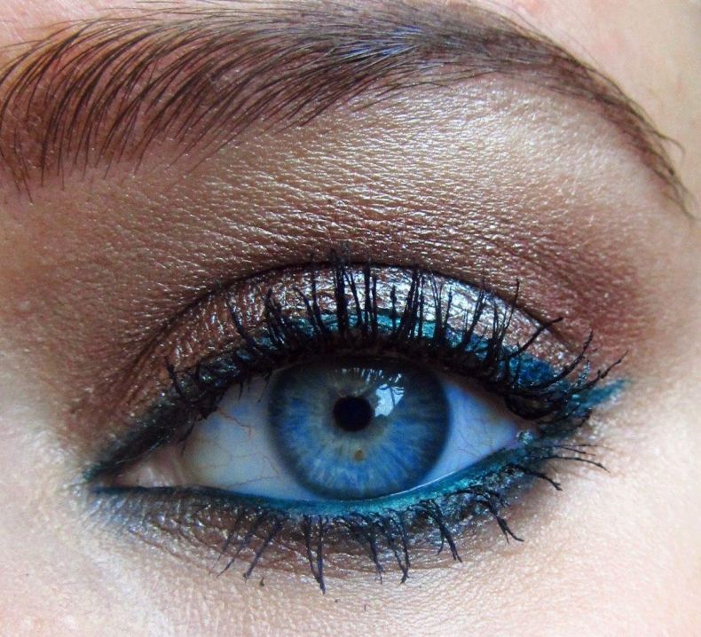 - Затем используют косметику бирюзового цвета, подчеркивая реснички на нижней части глаз. Уголки их выделяют легкими тенями.