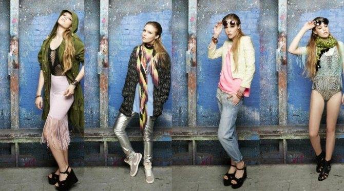 Взбитые кудряшки насыщенных цветов, помада и тени с блёстками, яркие румяна, блестящие короткие платья, изобилующие пайетками, лосины, «рваные» секси-маечки и шортики, украшенная стразами обувь на высоченных каблуках.