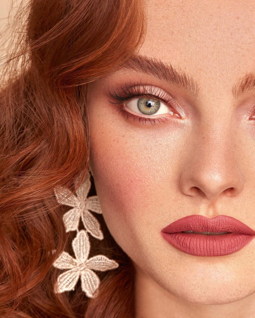 - Электрика. Матовые фактуры теней, тональных средств и помад, естественные брови, подчёркнутый румянами рельеф скул и сочные губы натуральных оттенков.
