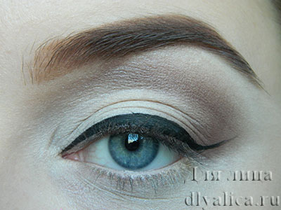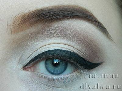 - После нанесения теней, необходимо нарисовать стрелки . Для этого, четко по линии роста ресниц проводится линия от внутреннего к внешнему уголку глаза с небольшим «приподнятием» хвостика стрелки. При этом предпочтение стоит отдавать не угольно-черным подводкам, а более мягким ее вариантам: коричневым, серым, сиреневым.