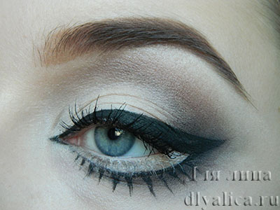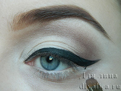Сначала на верхние и нижние веки наносятся очень светлые (белые, кремовые и т.п.) тени. Далее мы берем черную подводку и рисуем линию на верхнем подвижном веке. Подводку нужно наносить очень тонко и прямо по линии ресниц. На внутреннем угле глаза линия опускается вниз, а на внешнем — сначала слегка вниз, потом — вверх.