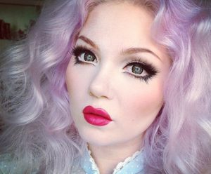 . Кукольный образ не предполагает выделение контура губ карандашом. Помада может быть любого оттенка, гармонирующего с общим макияжем. Поверх нее наносится немного блеска.